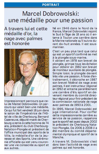 Lors de l'assemblée générale de la FFESSM, Marcel D. s'est vu remettre la médaille d'or de la jeunesse