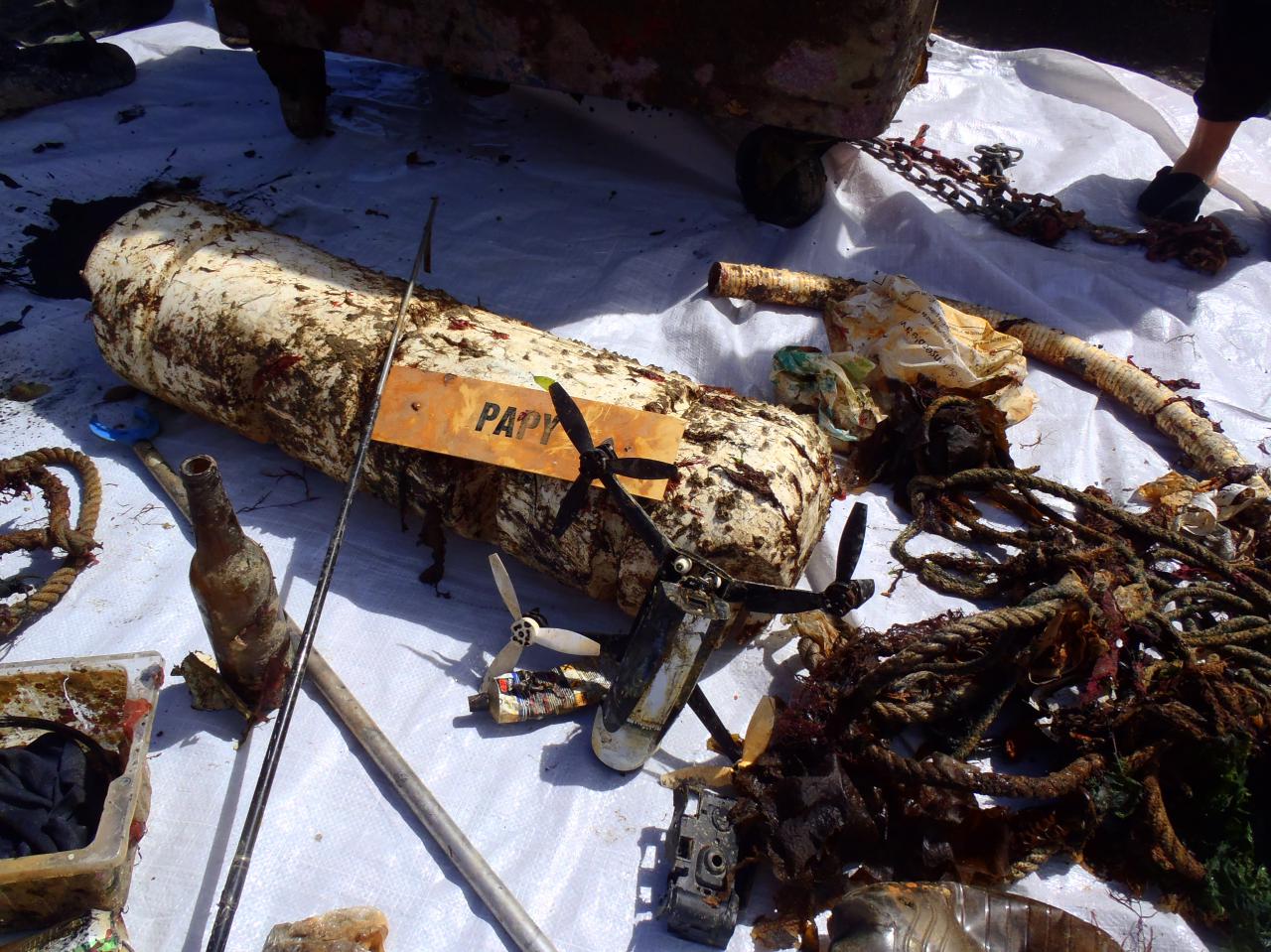 une eau chaude à 14°, pour remonter un container poubelle (qui a du apprendre la plongée un soir de beuverie), une ancre,